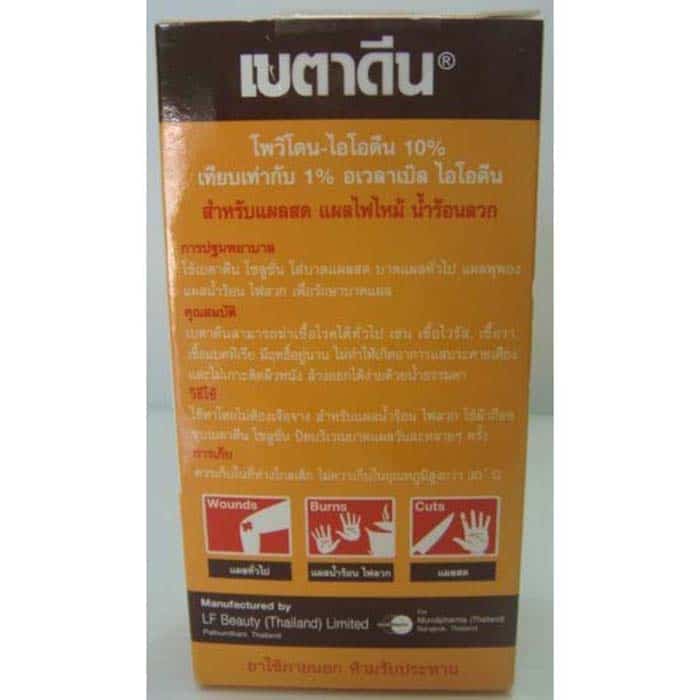 วิธีใช้ : ใช้ทาโดยไม่ต้องเจือจาง สำหรับแผลน้ำร้อน ไฟลวก ใช้ผ้าก๊อซชุบเบตาดีนปิดบริเวณบาดแผลวันละหลายๆ ครั้ง