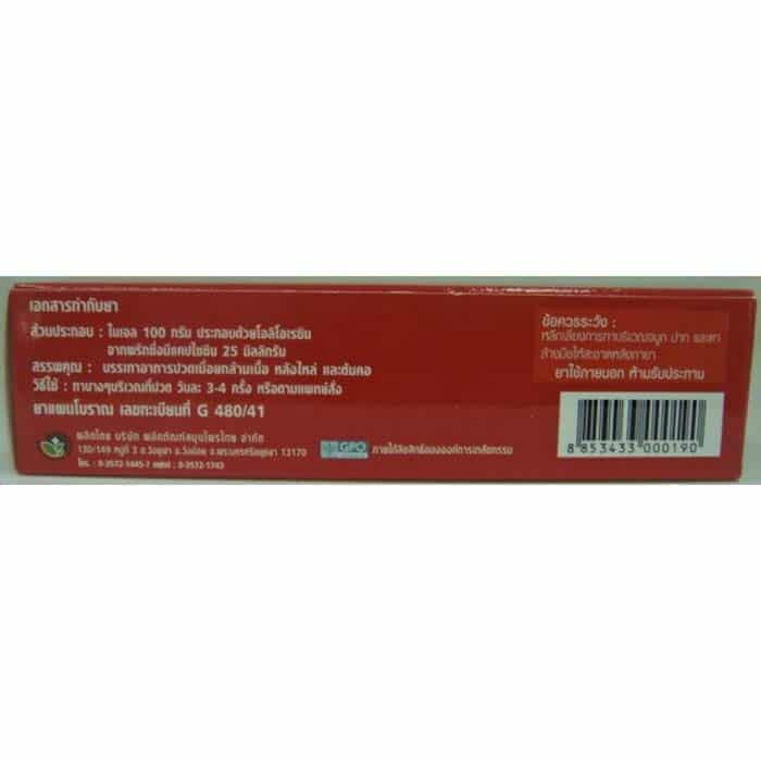 – ส่วนประกอบสำคัญ : ในเจล 100 กรัม ประกอบด้วยโอลิโอเรซินจากพริกซึ่งมีแคปไซซิน 25 มิลลิกรัม